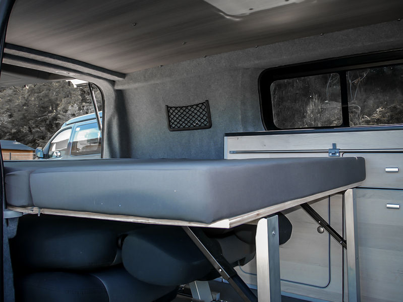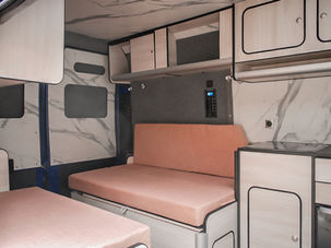 Toit levable SCA – mobilier HPL sur sur mesure - chauffage stationnaire autotherm 2D – Baie coulissant carbest – circuit 12v victron – circuit 220v avec chargeur – batterie lithium 85 AH – 55 litres eau propre 24 litres eaux usée – Isolation Armaflex + coton recyclé – Homologation VASP 3 places