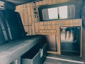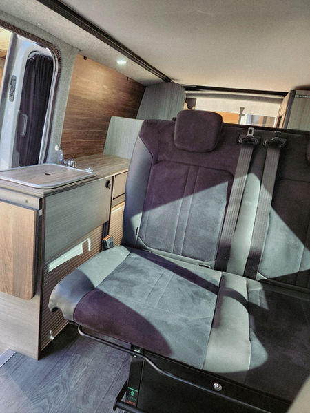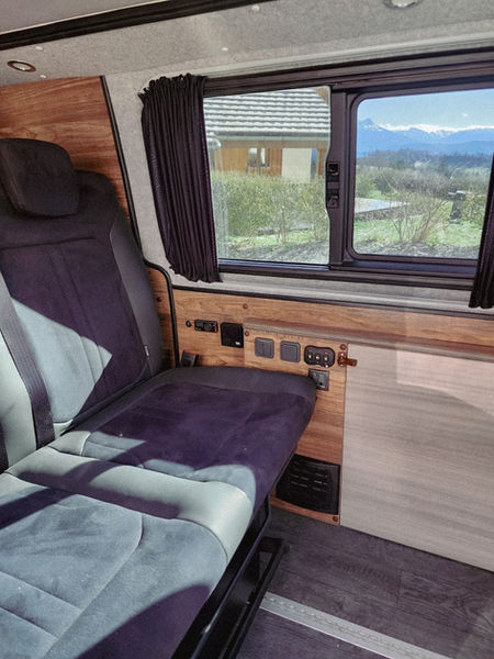 Aménagement personnalisé VASP 3 places, Douche et WC séparé, placard/porte tournant dans la douche, 360 watt de panneaux solaire, batterie lithium 200ah, Multiplus Victron 500VA, chaufage eau chaude par Thermobox evo Webasto, mobilier HPL, revêtement alcantara.
