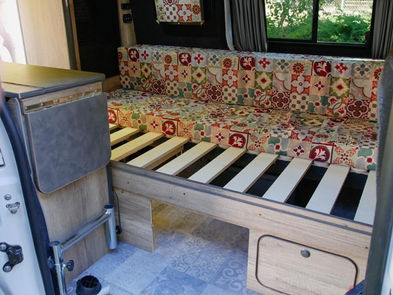 Aménagement avec banquette Schnierle convertible et coulissante sur rails.